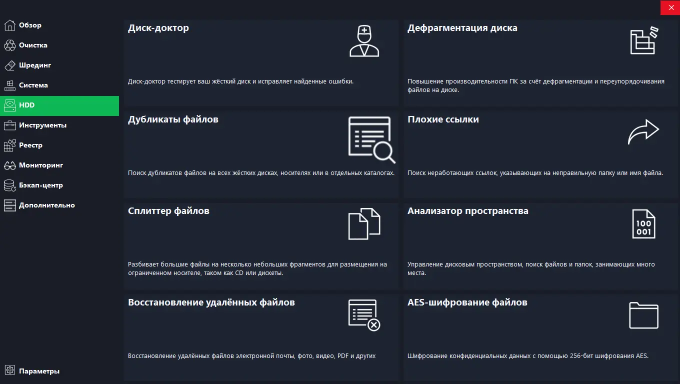 - Утилита включает в себя инструменты для анализа дискового пространства и выявления «мусорных» файлов.