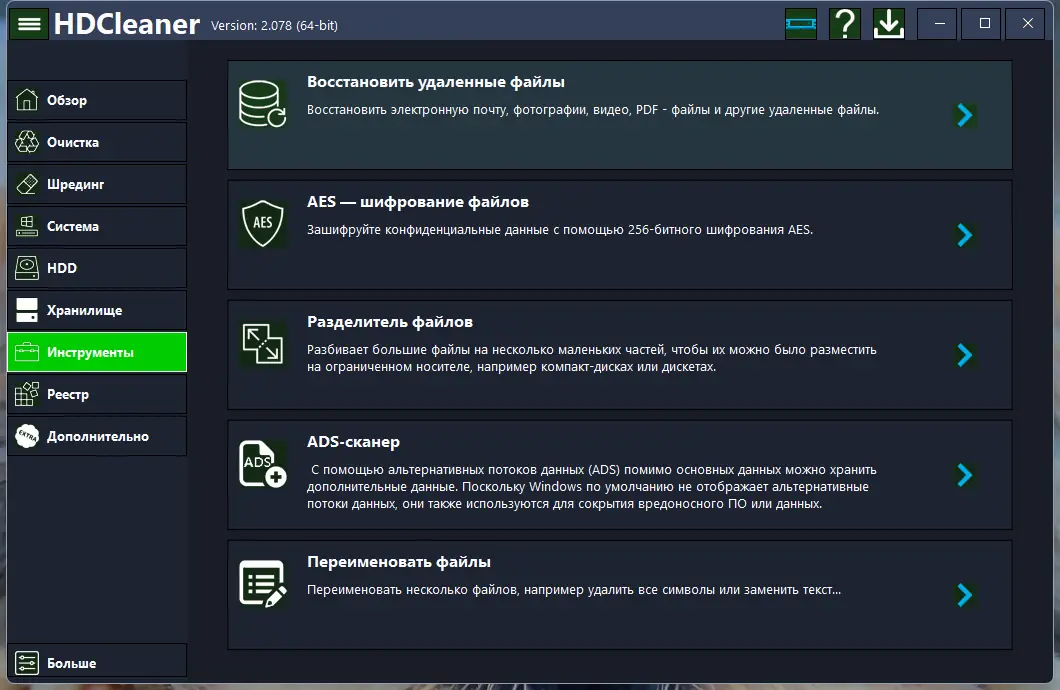 Программа предлагает широкий набор инструментов, при этом остаётся лёгкой и не перегружает системные ресурсы. Интерфейс минималистичный, но функциональный, а логика работы напоминает другие известные продукты того же разработчика, что упрощает переход для опытных пользователей. Поддержка портативных версий позволяет запускать HDCleaner с флеш-накопителя без установки, что особенно удобно при обслуживании чужих компьютеров. При этом функционал не урезан по сравнению с инсталлируемой версией.