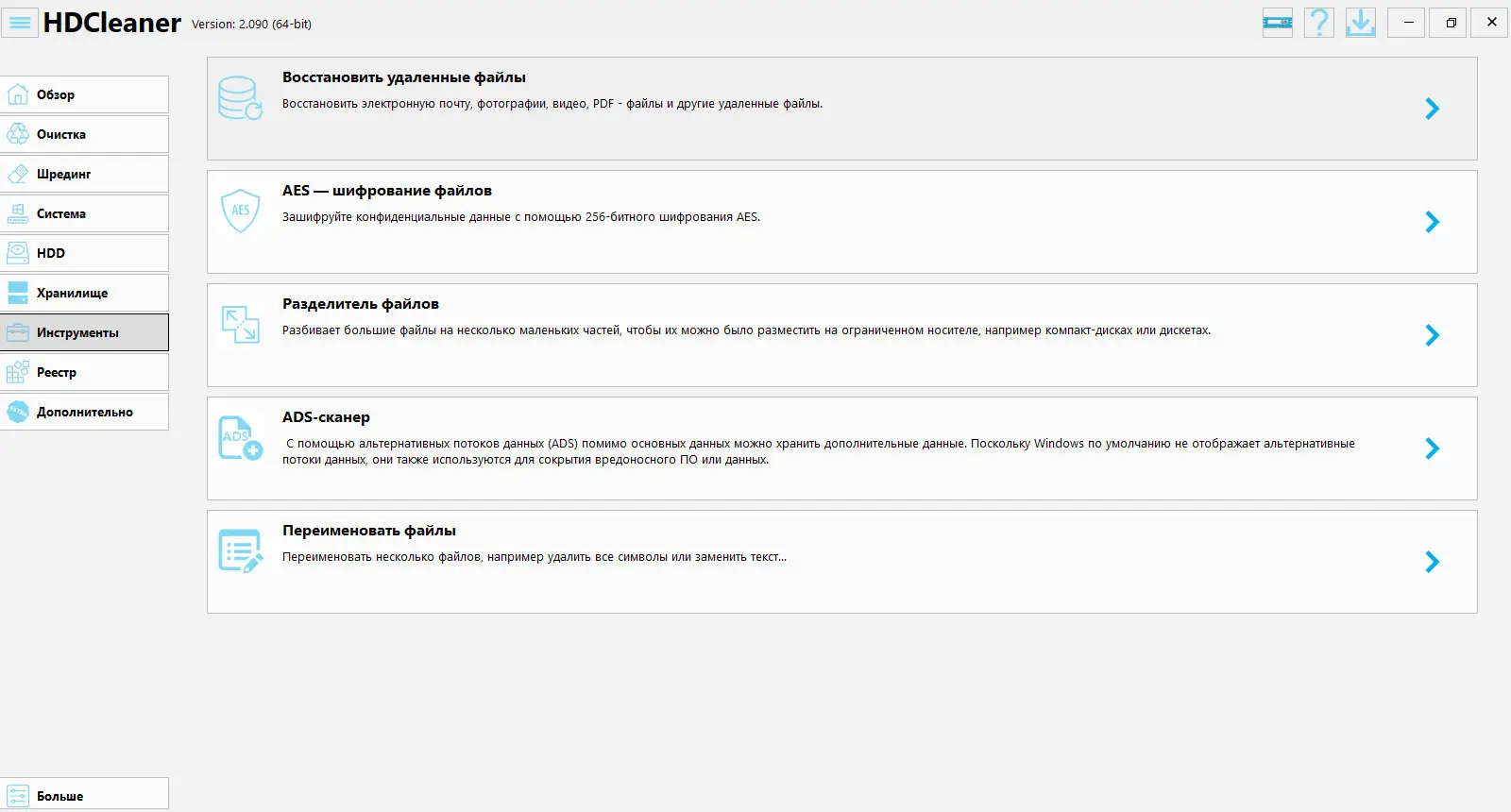 - Программа включает инструменты для шифрования, удаления временных файлов и анализа дискового пространства.