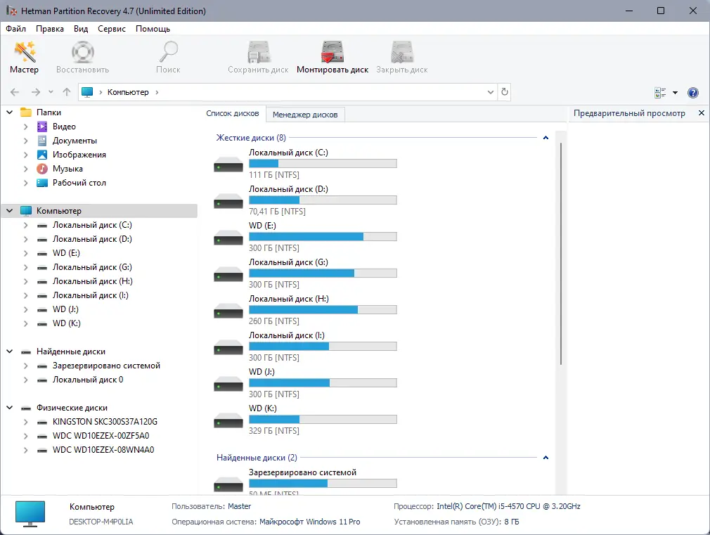 Интерфейс программы выполнен по аналогии с проводником Windows, что упрощает навигацию даже для новичков. После запуска утилита отображает все подключённые носители, включая скрытые и неопознанные разделы. Пользователь выбирает нужный диск и запускает один из двух режимов сканирования — быстрый или полный. Быстрый режим подходит для недавно удалённых файлов, а полный анализирует каждый сектор диска для поиска остаточных данных.