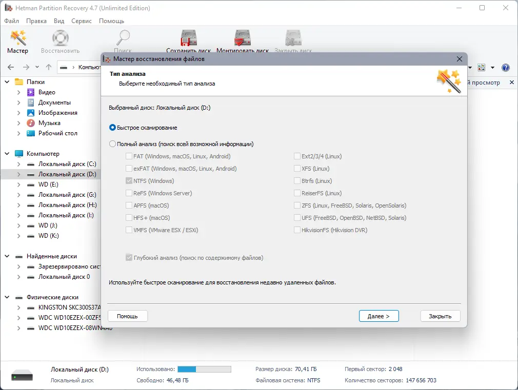 Hetman Partition Recovery демонстрирует высокую эффективность при работе с повреждёнными дисками и потерянными разделами. Программа автоматически распознаёт тип файловой системы и подбирает оптимальный алгоритм восстановления. Она не требует технических знаний и справляется с задачами, которые обычно решаются в специализированных сервисных центрах. Благодаря встроенному пошаговому мастеру, пользователь может восстановить данные, просто отвечая на вопросы.