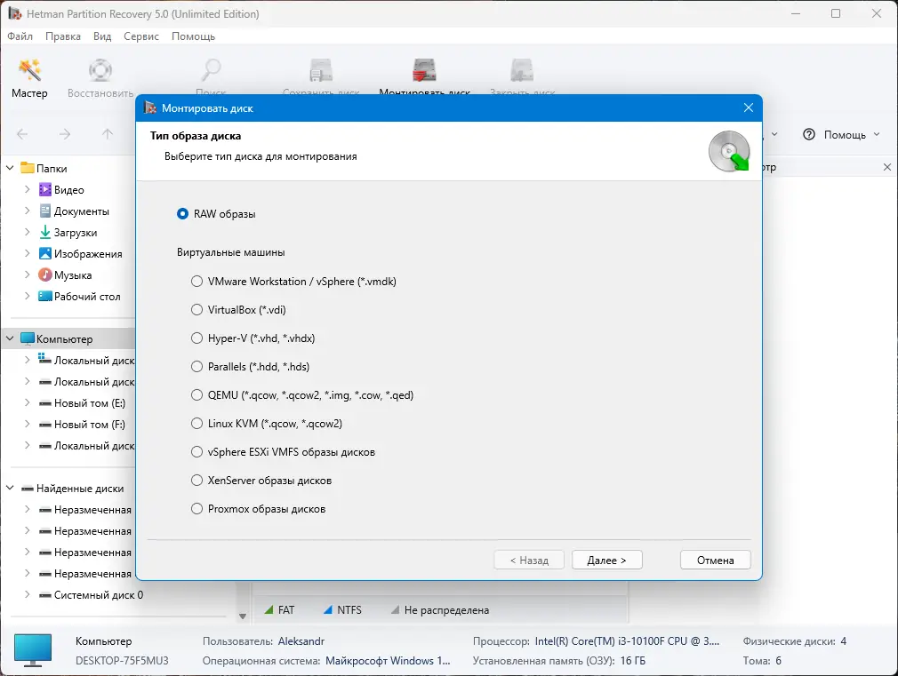- Возможность восстановления данных с виртуальных дисков (VDI, VMDK, VHD, VHDX, HDD, QCOW2 и др.) и гипервизоров.