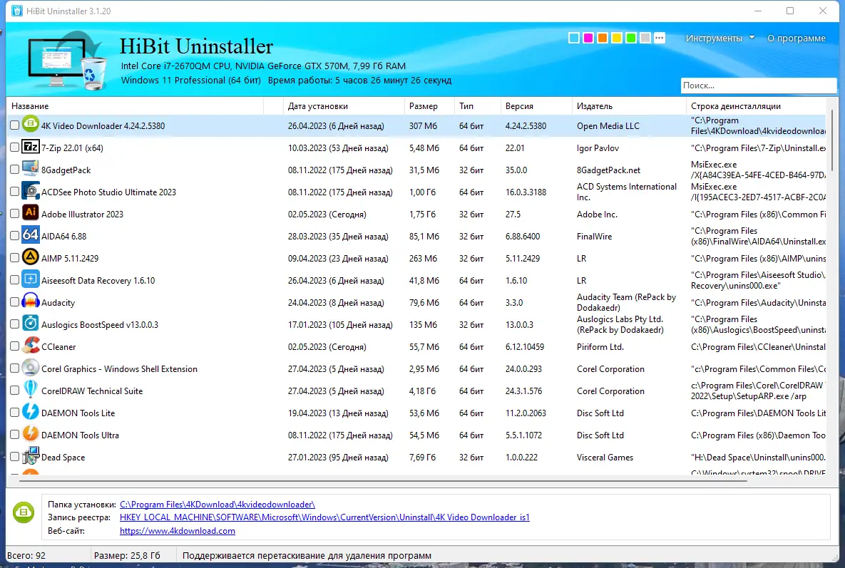 - Позволяет удалять как обычные программы, так и системные компоненты, включая приложения из Windows Store.