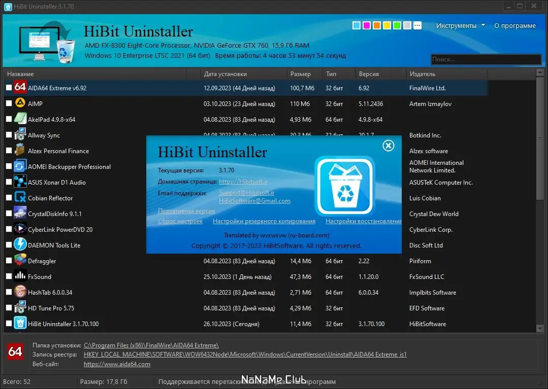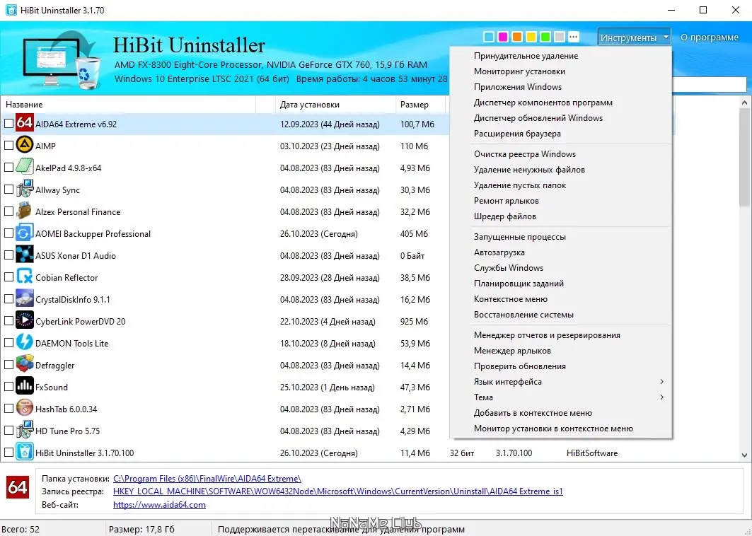 HiBit Uninstaller — это мощная утилита для полного удаления приложений в Windows с дополнительными инструментами оптимизации системы. Программа эффективно удаляет как обычные, так и встроенные приложения, проводит очистку реестра и остаточных файлов, а также включает в себя набор системных инструментов для управления автозагрузкой, процессами и службами.