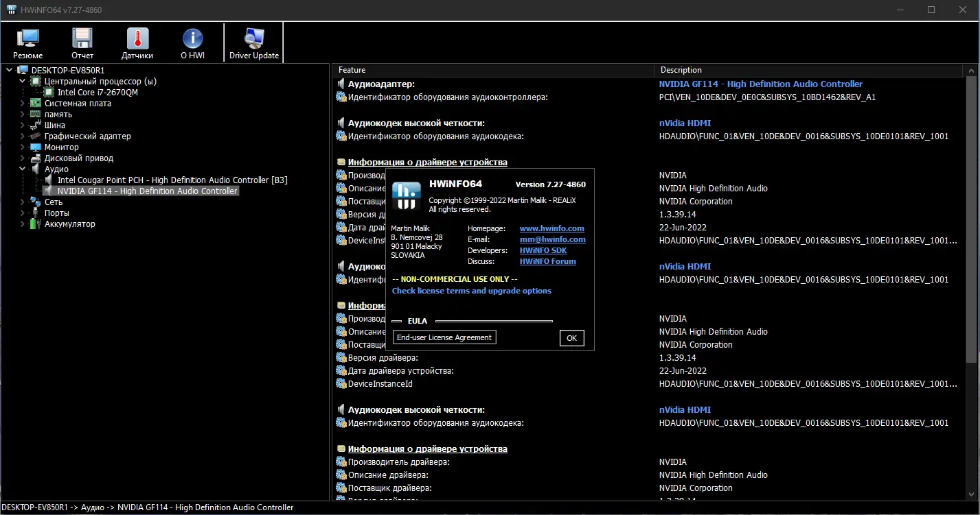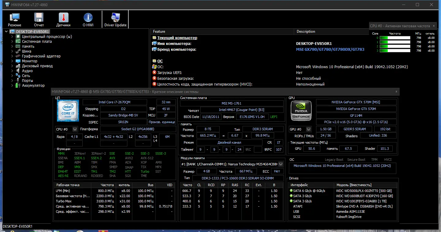 - Отображает полные сведения о процессоре, материнской плате, оперативной памяти и видеокарте.
