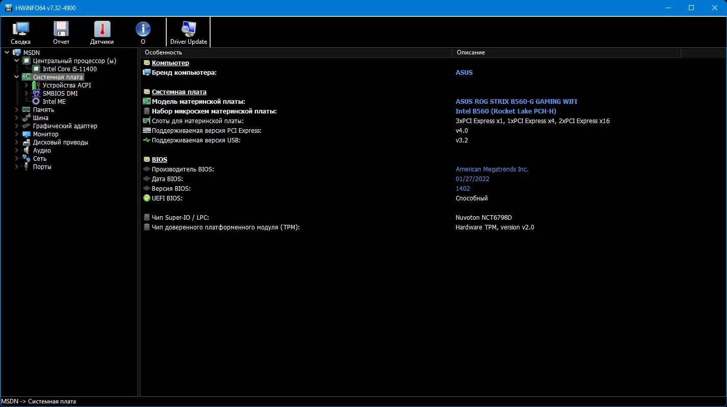 - Отображение подробных сведений о всех компонентах системы, включая микросхемы и датчики.
