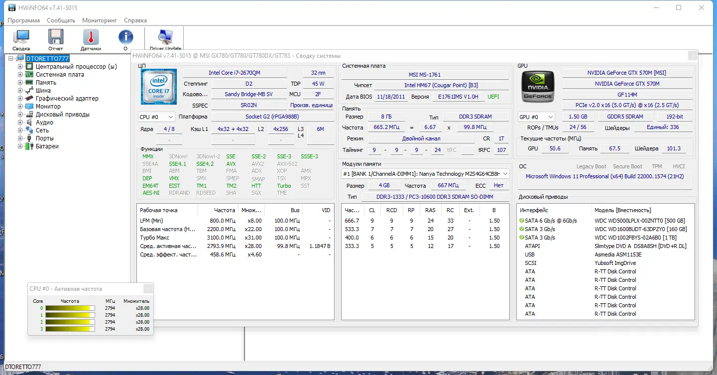 - Отображение технических характеристик всех основных компонентов системы, включая материнскую плату, центральный и графический процессоры, оперативную память и дисковые устройства.