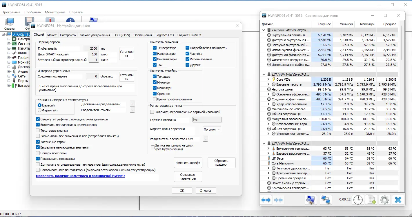 - Мониторинг показаний датчиков в реальном времени: температура, частота, напряжение, загрузка ЦП и GPU, скорость вращения вентиляторов.