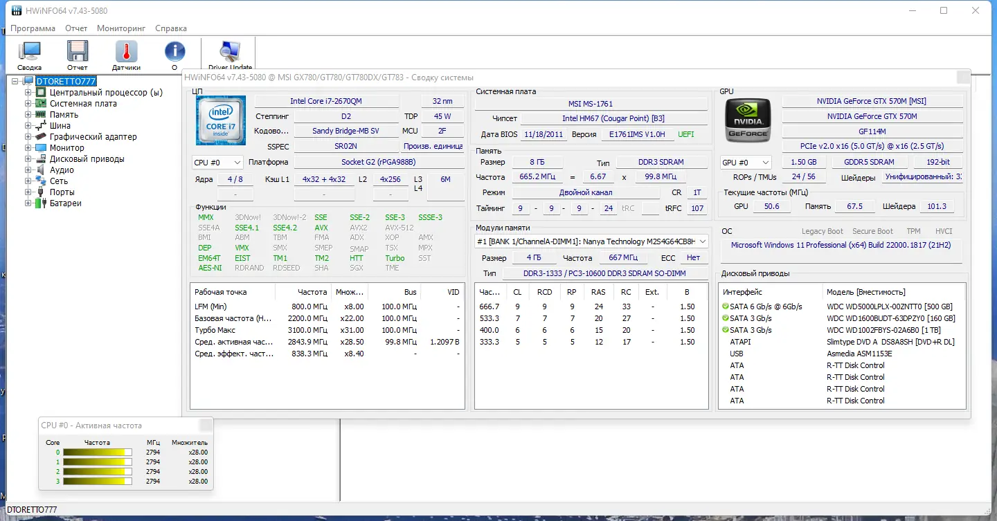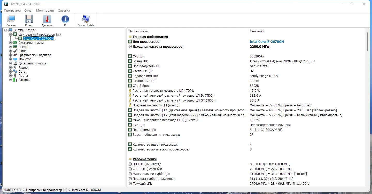- Сбор подробных сведений о центральном и графическом процессорах, включая архитектуру, кэш, частоты и технологический процесс.