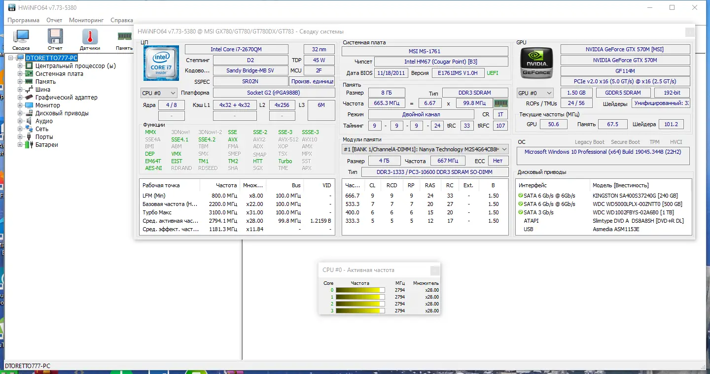 - Отображение подробных характеристик процессора, материнской платы, видеокарты и оперативной памяти.