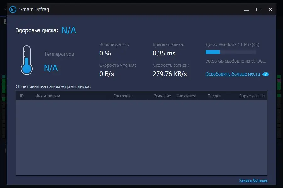 - Реализована поддержка умной оптимизации, включая мониторинг состояния диска: температуры, нагрузки и данных S.M.A.R.T.