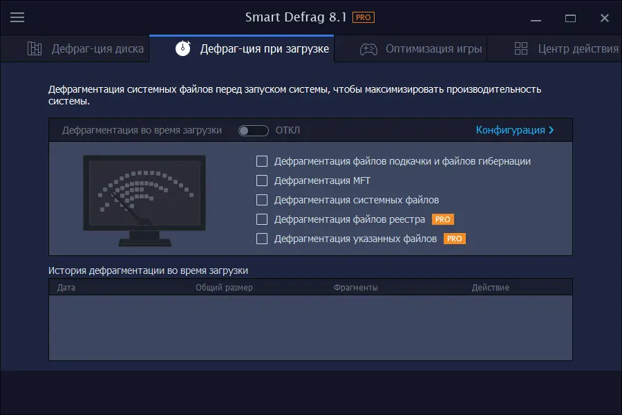 - Применение технологии дефрагментации при загрузке системы для обработки системных файлов, недоступных в обычном режиме.