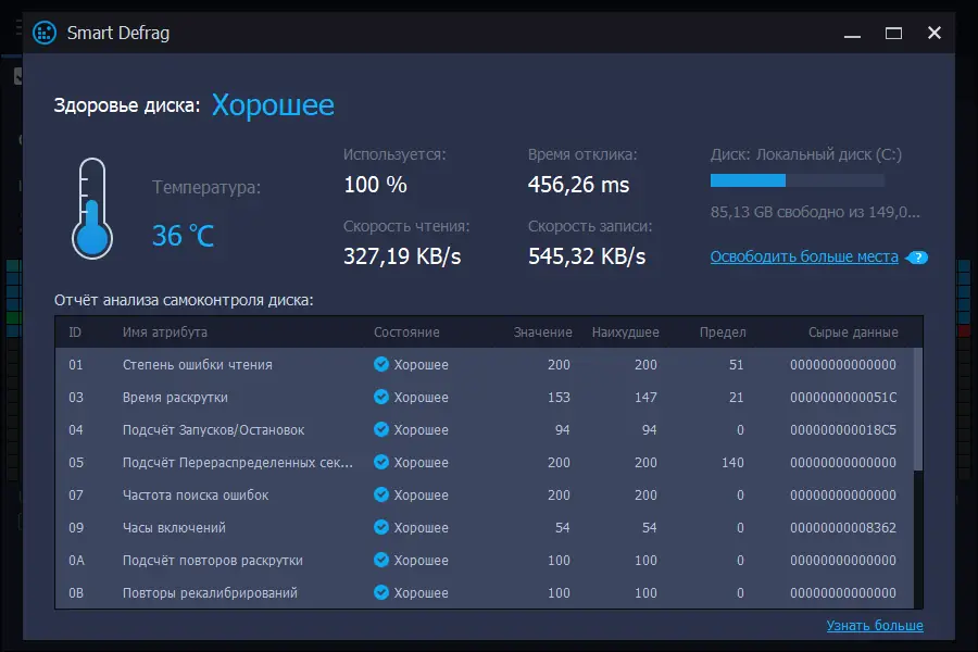 - Обеспечивает безопасность данных благодаря технологии Safe Intelligence, которая анализирует состояние диска и решает, когда проводить дефрагментацию без риска для его ресурса.