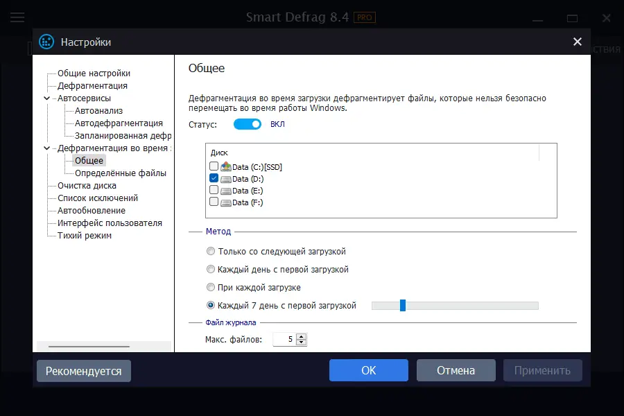 - Для систем с SSD функционал ограничен, так как дефрагментация таких накопителей не требуется и может сократить их ресурс.