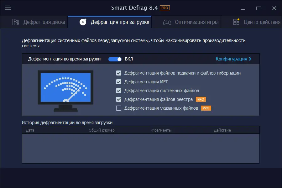 - Технология дефрагментации при загрузке системы позволяет оптимизировать файлы, которые невозможно обработать в обычном режиме, включая системные и заблокированные элементы.