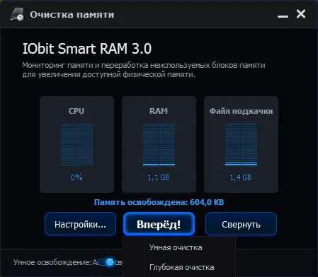 IObit Smart RAM — это компактная утилита для оптимизации оперативной памяти, способная повысить производительность компьютера за счёт освобождения неиспользуемых ресурсов RAM. Программа подходит для устройств с ограниченным объёмом памяти и работает в двух режимах: умная очистка и глубокая очистка, обеспечивая баланс между эффективностью и стабильностью системы.