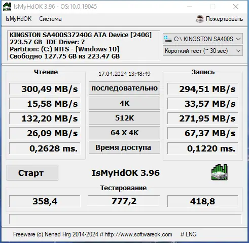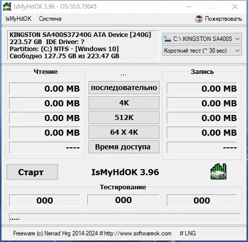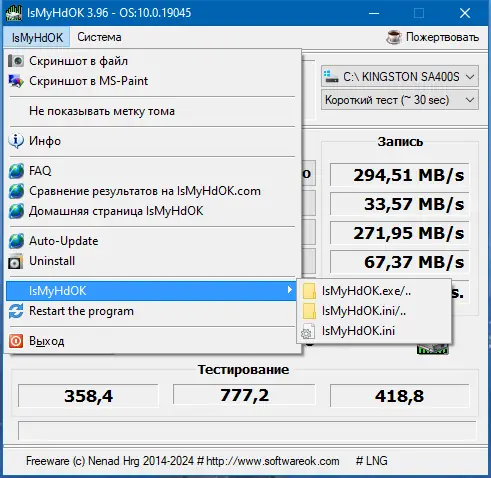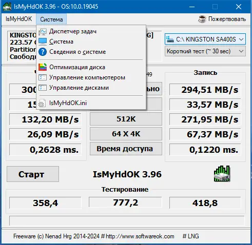 IsMyHdOK — компактная утилита для тестирования производительности жестких дисков и твердотельных накопителей. Программа позволяет быстро оценить скорость работы HDD, SSD и USB-девайсов, не перегружая систему, и подходит как для повседневного использования, так и для диагностики накопителей на работоспособность.
