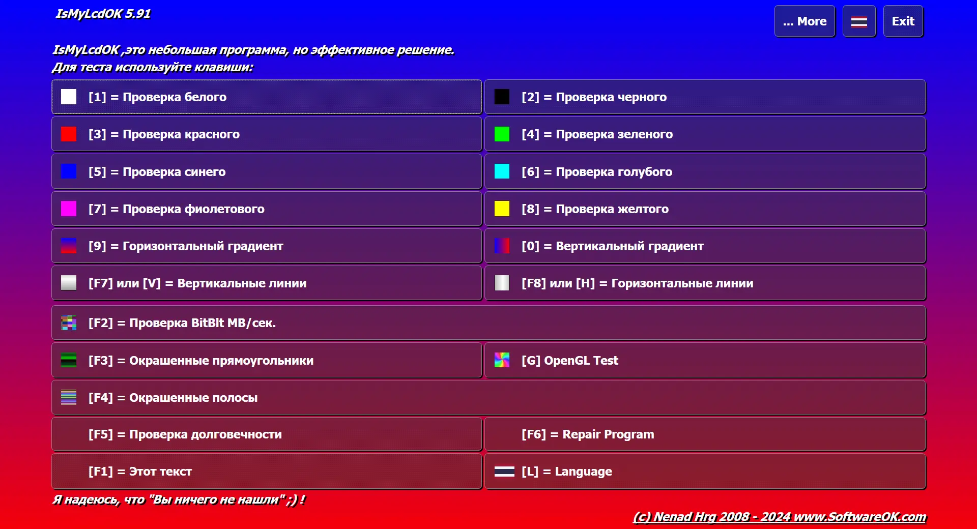IsMyLcdOK предлагает простое и эффективное решение для визуальной диагностики экранов. Её основная цель — помочь пользователю быстро определить наличие дефектов, не прибегая к сложным инструментам. Программа отлично справляется с поставленной задачей, особенно учитывая её размер и отсутствие зависимости от установки.