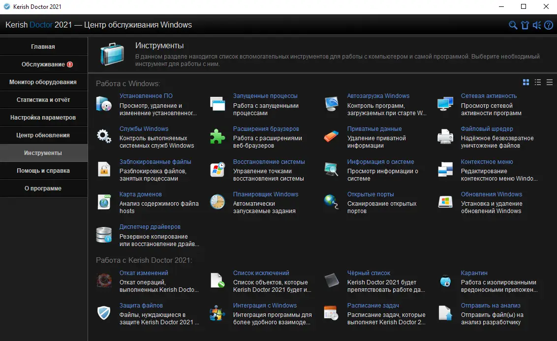 Kerish Doctor — это программа для автоматической оптимизации и защиты операционной системы Windows. Она сочетает в себе функции профилактики сбоев, очистки системы, ускорения интернета и игр, а также предоставляет инструменты для обновления программ и устранения типичных неполадок. Работает в фоновом режиме или в ручном режиме по требованию пользователя.