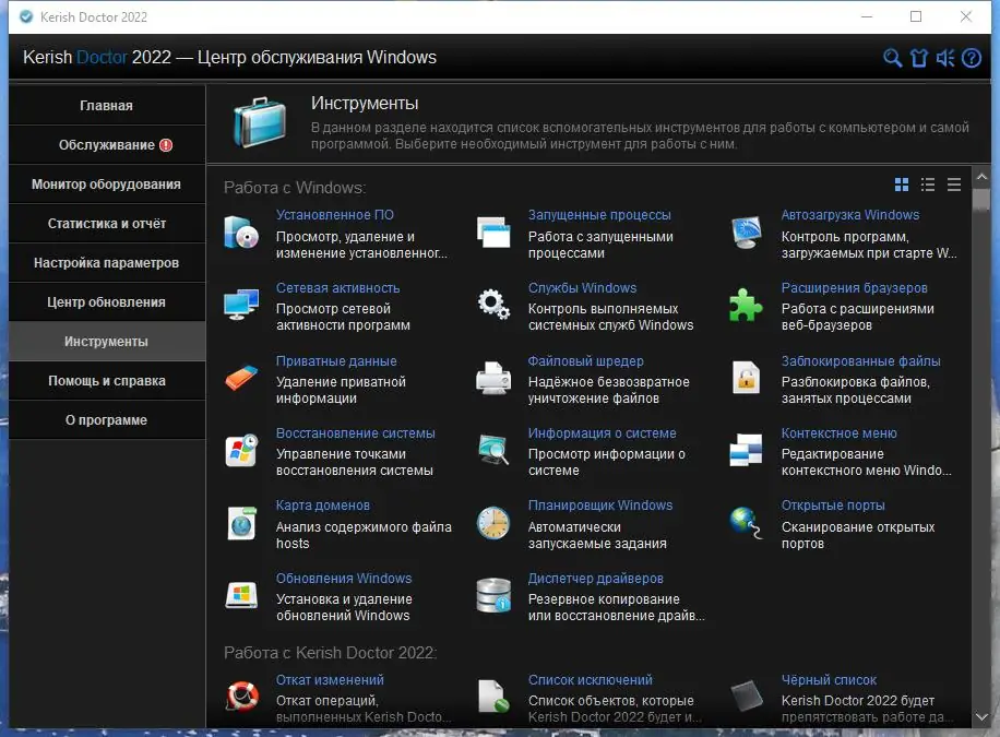 Kerish Doctor — программное обеспечение для автоматической оптимизации и защиты операционной системы Windows. Утилита работает в фоне или по требованию, предотвращая сбои, устраняя ошибки, очищая систему и повышая производительность. Программа сочетает в себе интеллектуальные технологии и простоту использования, обеспечивая стабильную работу компьютера без вмешательства пользователя. Поддержка актуальных версий Windows и регулярные обновления делают её надёжным решением для ухода за системой.