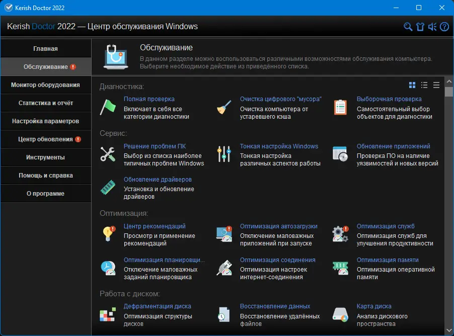 Kerish Doctor представляет собой многофункциональный инструмент, предназначенный для комплексного обслуживания компьютера на базе Windows. Приложение работает в двух режимах: фоновом, когда оно активно защищает систему в реальном времени, и ручном, позволяющем выполнять диагностику и настройку по требованию. В первом случае программа запускается с системой и незаметно предотвращает сбои, во втором — используется как диагностическая утилита при появлении проблем. Такой подход обеспечивает гибкость и контроль над процессами.