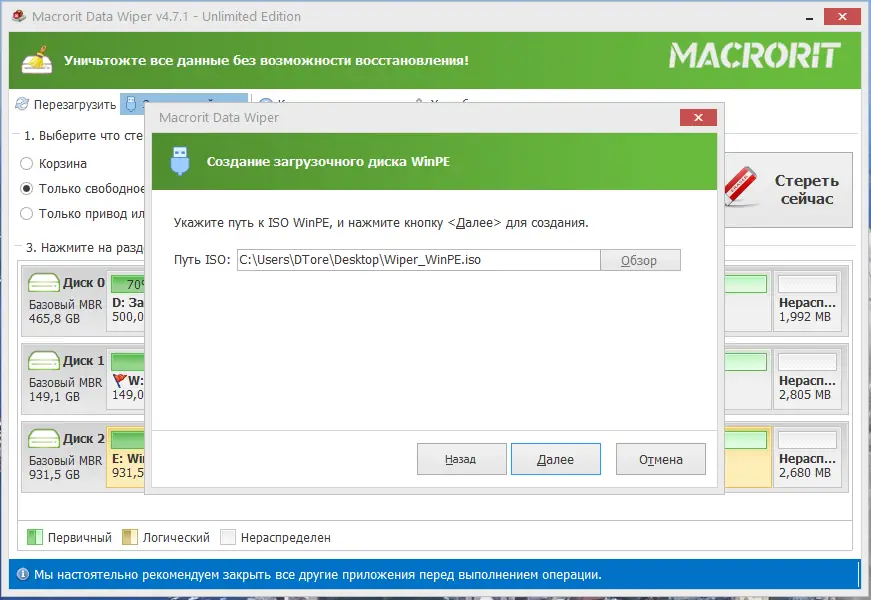 - Поддерживается очистка отдельных разделов, всего диска или свободного места с выбором метода перезаписи.