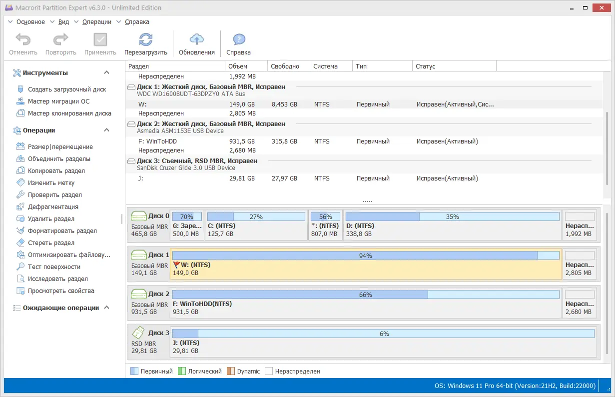 Интерфейс Macrorit Partition Expert интуитивно понятен и не требует углублённых знаний. После запуска отображается полная схема дисков и разделов, где можно визуально выбрать нужный раздел для изменения. Доступны контекстные действия: изменение размера, перемещение, форматирование, удаление и создание новых разделов. Каждая операция проходит в несколько этапов с предварительным просмотром изменений, что исключает случайные ошибки.