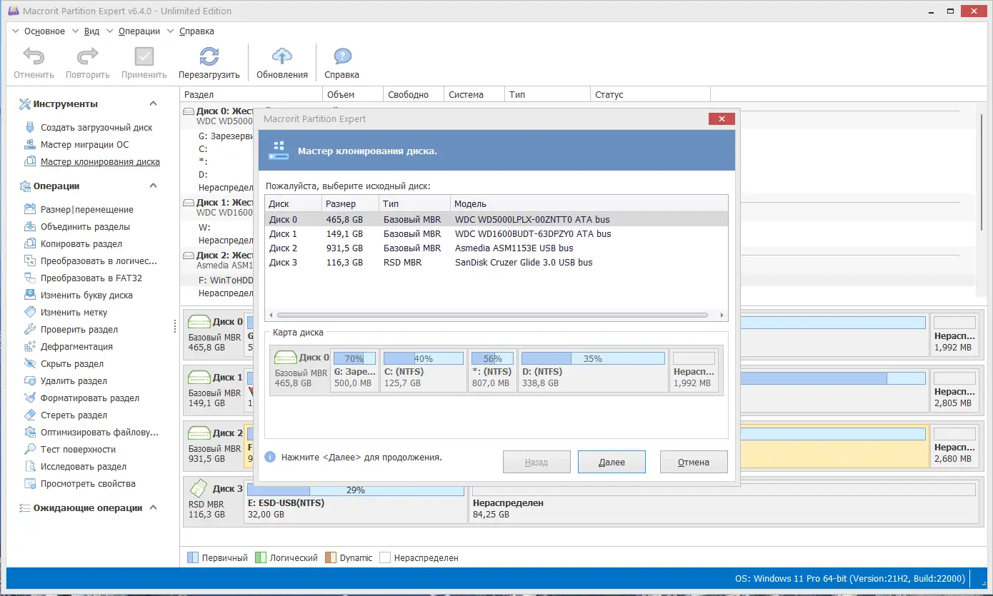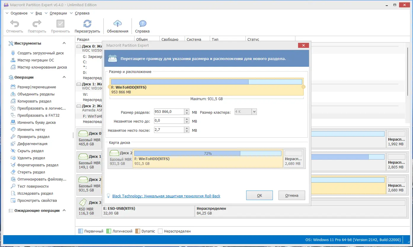 - Позволяет отменить любую операцию в процессе выполнения, что повышает безопасность при настройке дисков.