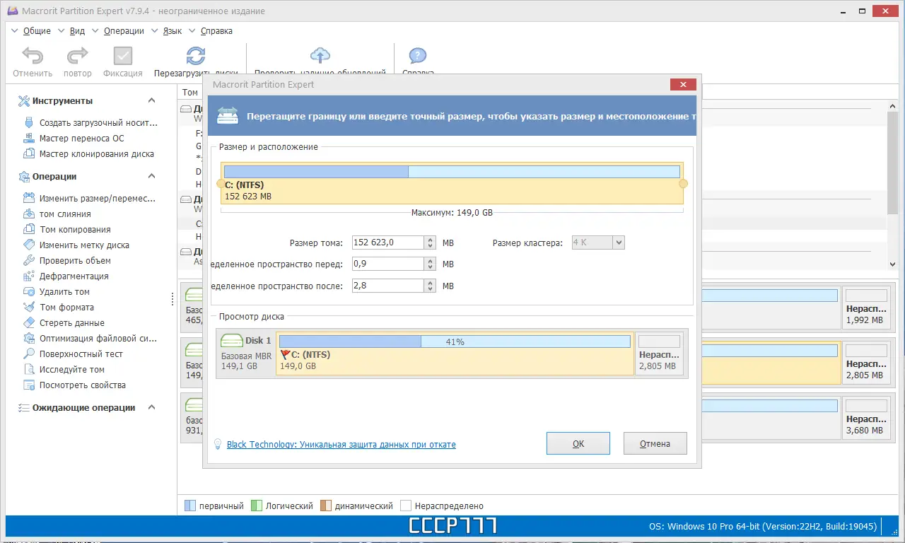 Интерфейс программы интуитивно понятен и организован в виде графического представления всех подключённых дисков и их разделов. Пользователь может щёлкнуть правой кнопкой мыши по любому разделу, чтобы вызвать контекстное меню с доступными действиями: изменение размера, перемещение, форматирование, удаление или создание нового раздела. Все операции можно комбинировать в очередь, а затем выполнять последовательно. В любой момент можно отменить задачу до её завершения, что особенно полезно при работе с системными дисками. Для сложных случаев предусмотрена возможность создания загрузочного носителя, позволяющего проводить изменения с дисками, когда операционная система не запускается. Утилита также поддерживает работу в portable-режиме, что удобно для использования с флеш-накопителей.