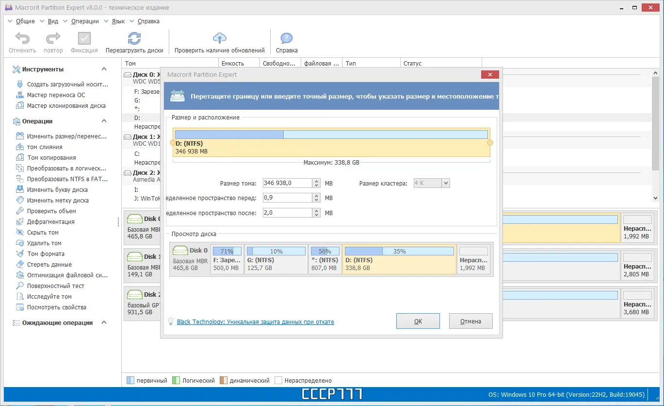 - Изменение размеров разделов без потери данных