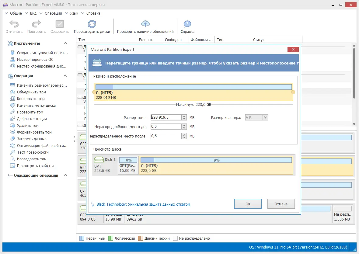 Уникальный алгоритм перемещения данных обеспечивает максимальную скорость и безопасность операций с дисками.
