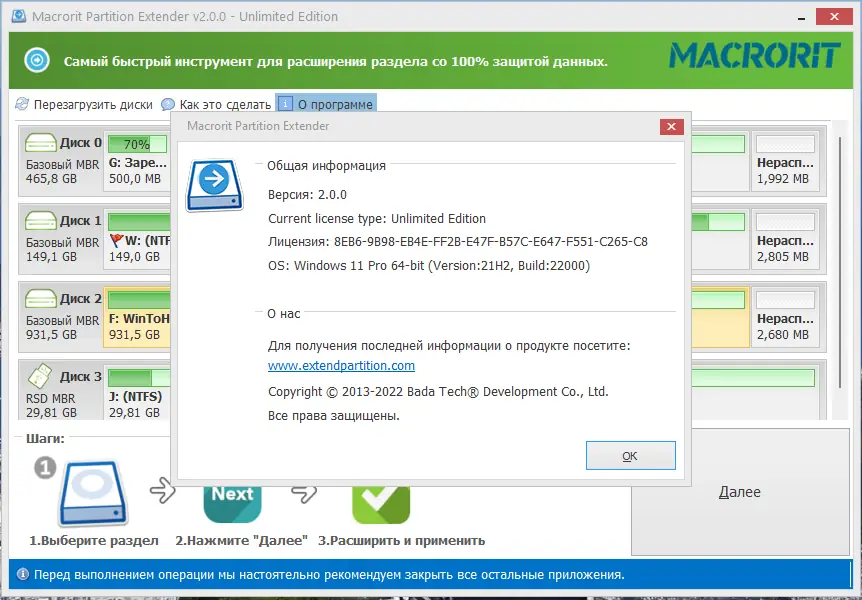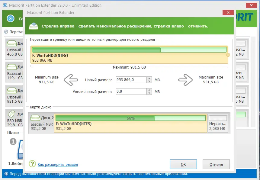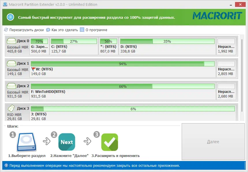 - Возможность расширить диск, не удаляя и не форматируя разделы.