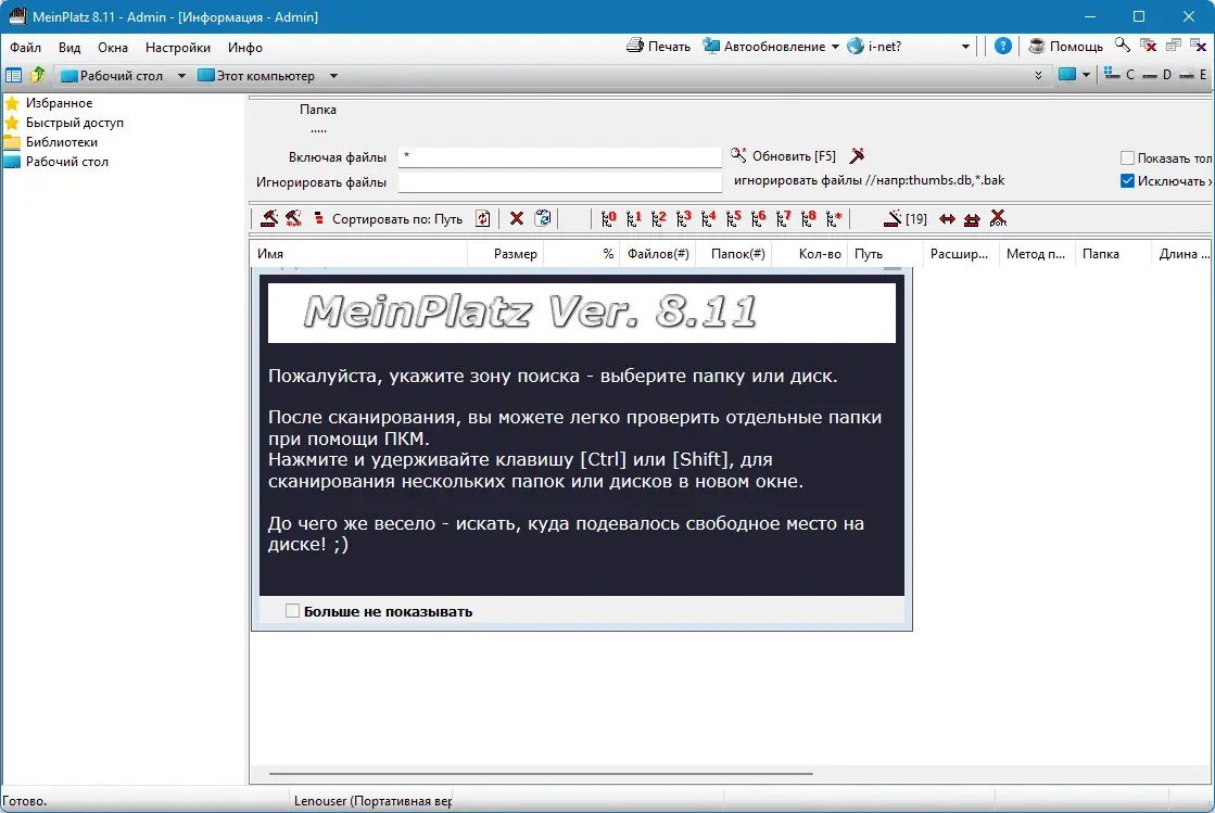 MeinPlatz — это компактная утилита для анализа занятого места на жёстких дисках, позволяющая быстро выявить крупные файлы и папки, которые занимают значительный объём дискового пространства. Программа работает без установки, поддерживает экспорт данных и предлагает наглядную группировку результатов по типам файлов, размеру, дате создания и другим критериям.