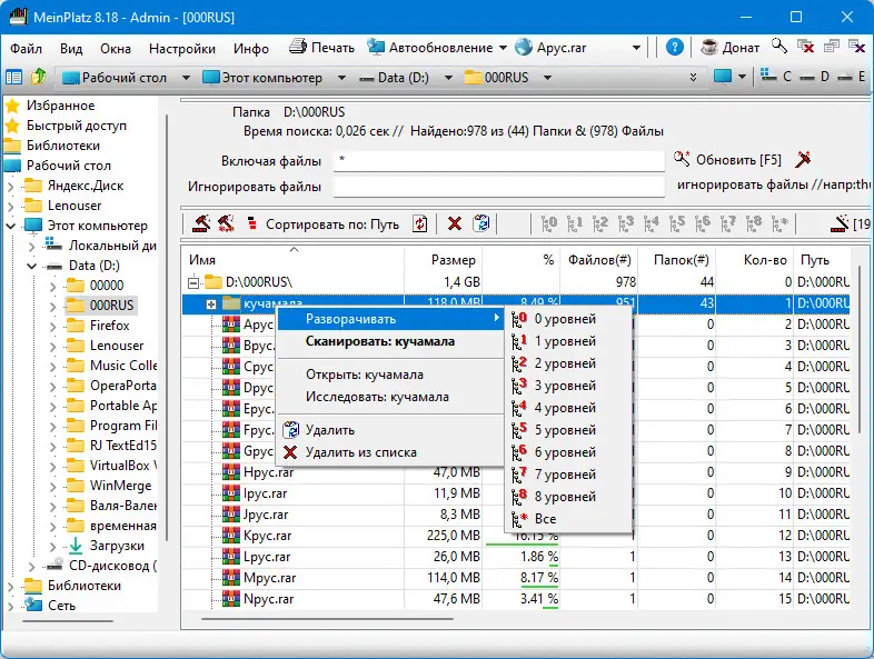 - Поддержка глубокого сканирования с детализацией до отдельных файлов