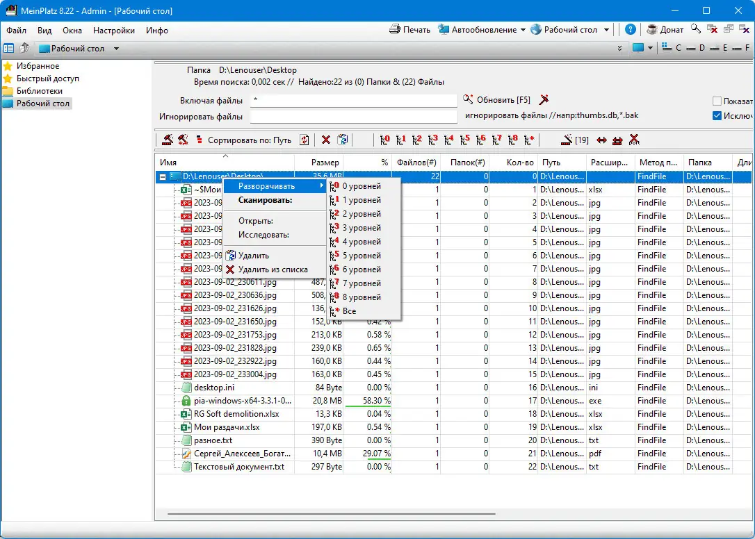 После запуска приложения пользователь выбирает диск или конкретную папку для сканирования. Процесс анализа начинается мгновенно и отображает прогресс в реальном времени. По завершении сканирования открывается таблица с файлами, отсортированными по умолчанию по объёму занимаемого места. Дополнительно доступна сортировка по имени, расширению, дате последнего доступа и другим параметрам. Интерфейс остаётся интуитивным даже при большом количестве данных. Пользователь может раскрыть любую папку, чтобы увидеть её внутреннее содержание, и точно определить, какие файлы стоит удалить или перенести.