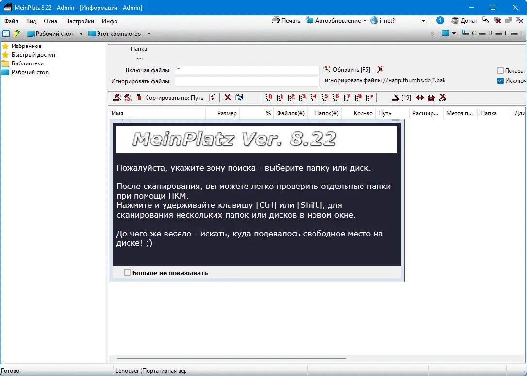 MeinPlatz — это компактная утилита для анализа дискового пространства, позволяющая быстро выявить крупные файлы и папки, занимающие место на жёстком диске. Программа сканирует выбранные разделы и предоставляет детальную статистику в удобной форме.
