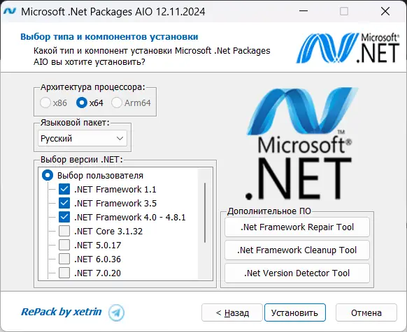 Установка осуществляется через единый инсталлятор с поддержкой тихого режима. Пользователь может выбрать нужную версию .NET, архитектуру системы и язык интерфейса. Для автоматизированных развёртываний доступны командные ключи, такие как /VERYSILENT, /X64, /NetFw35, /NetAll и другие. Утилиты в составе пакета запускаются отдельно через параметры /R, /CU и /VD.