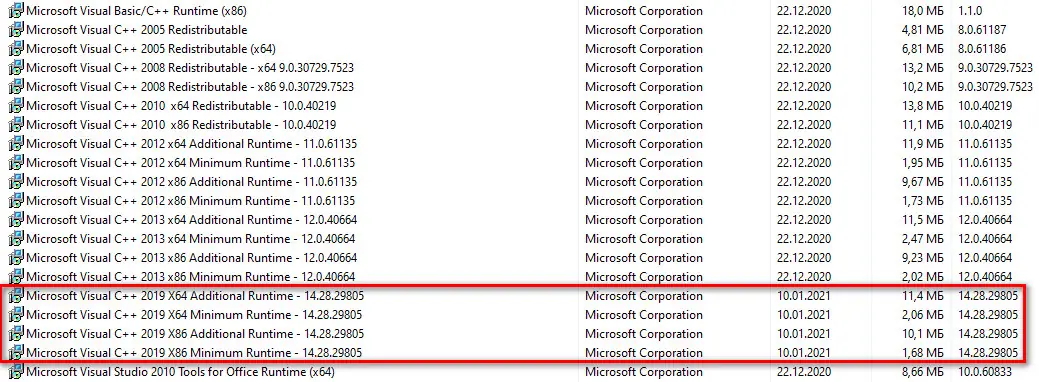 Работа с Microsoft Visual C++ Runtimes