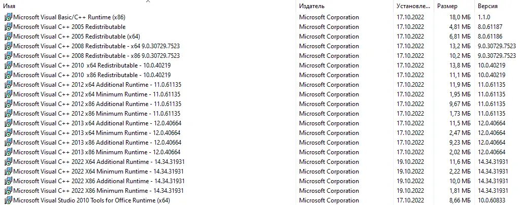 Microsoft Visual C++ Runtimes — это набор распространяемых компонентов, необходимых для запуска приложений, разработанных с использованием Visual Studio. Без их установки многие программы не смогут функционировать, поскольку зависят от библиотек среды выполнения Visual C++.