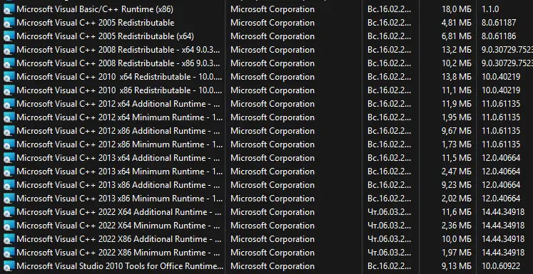 Работа с Microsoft Visual C++ Runtimes