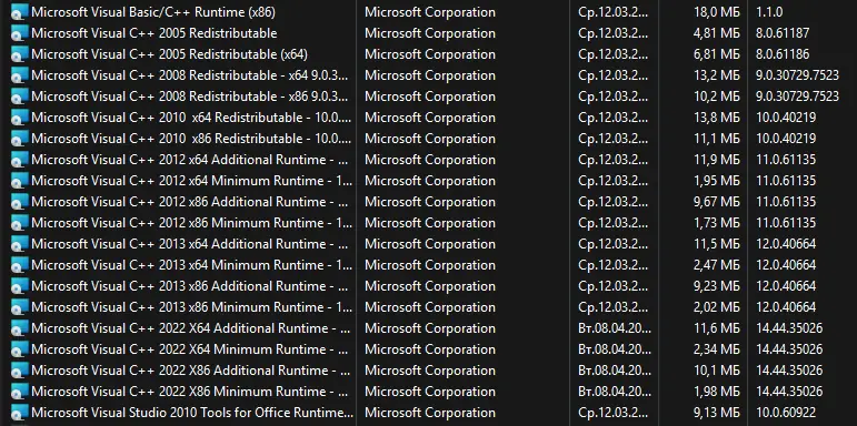 Microsoft Visual C++ Runtimes — это набор распространяемых компонентов, необходимых для запуска приложений, разработанных с использованием Visual Studio. Они включают в себя библиотеки среды выполнения, такие как CRT, стандартная библиотека C++, MFC, OpenMP и другие. Установка пакета обеспечивает совместимость программного обеспечения с системой, предотвращая ошибки, связанные с отсутствием необходимых модулей.