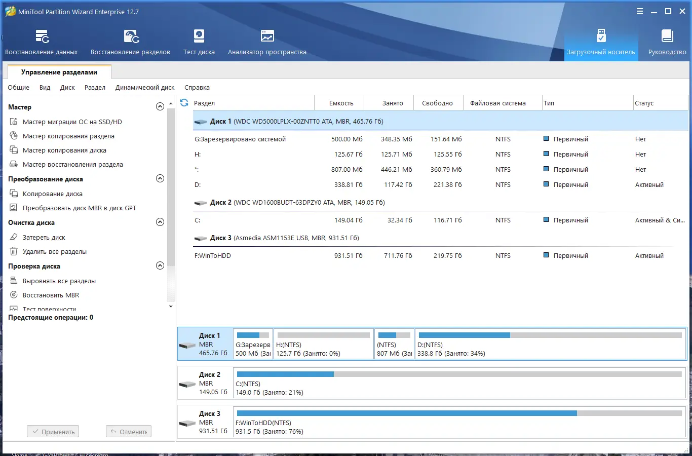 MiniTool Partition Wizard представляет собой профессиональную утилиту для управления жесткими дисками и разделами. Она позволяет выполнять широкий спектр операций, начиная от базовых действий, таких как создание и форматирование разделов, и заканчивая продвинутыми функциями вроде клонирования дисков и восстановления загрузочной записи. Инструмент совместим с современными стандартами разметки дисков MBR и GPT, а также поддерживает работу с RAID-массивами и дисками объемом более 3 ТБ.