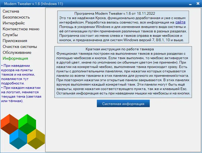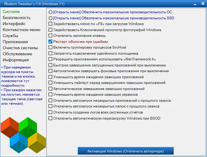 Modern Tweaker — это программная оболочка для тонкой настройки операционной системы, предназначенная для оптимизации производительности Windows. С её помощью пользователь может легко изменять системные параметры, улучшая скорость работы и персонализируя интерфейс. Инструмент подходит как для новичков, так и для продвинутых пользователей, стремящихся получить максимум от своей системы.