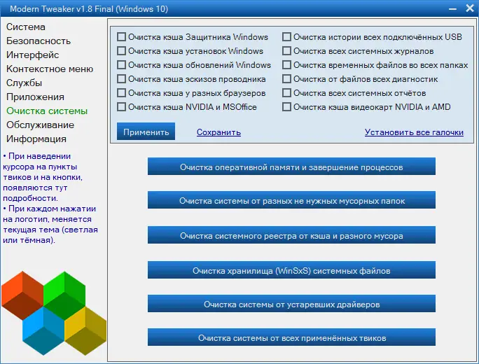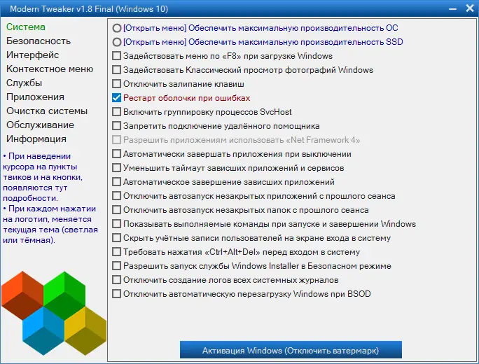 - Содержит более 100 оптимизационных твиков, сгруппированных по логическим разделам: Система, Интерфейс, Безопасность, Службы Windows и Фоновые приложения.