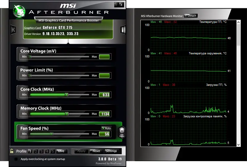 MSI Afterburner — это мощная утилита для разгона и тонкой настройки видеокарт, совместимая с оборудованием различных производителей. Программа предоставляет контроль над частотами ядра, памяти и шейдеров, позволяет регулировать напряжение и управлять оборотами вентиляторов. Встроенная система мониторинга отображает ключевые параметры в реальном времени, включая температуру и производительность в игре.
