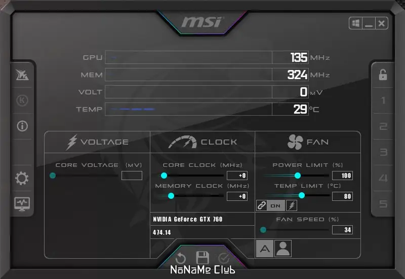 После установки утилита автоматически определяет установленную видеокарту и отображает её основные характеристики: модель, версию BIOS, драйвера и текущие тактовые частоты. Пользователь может изменять параметры через ползунки, задавая желаемые значения для ядра, памяти и напряжения. Для контроля температуры доступен графический интерфейс кривой вращения вентилятора, где можно задать зависимость оборотов от нагрева. Активация профилей осуществляется с помощью горячих клавиш, что особенно удобно при переключении между разными режимами работы — например, между офисной нагрузкой и запуском требовательной игры. В настройках можно включить оверлей, выводящий информацию прямо в окно приложения, включая FPS, температуру GPU и использование видеопамяти.