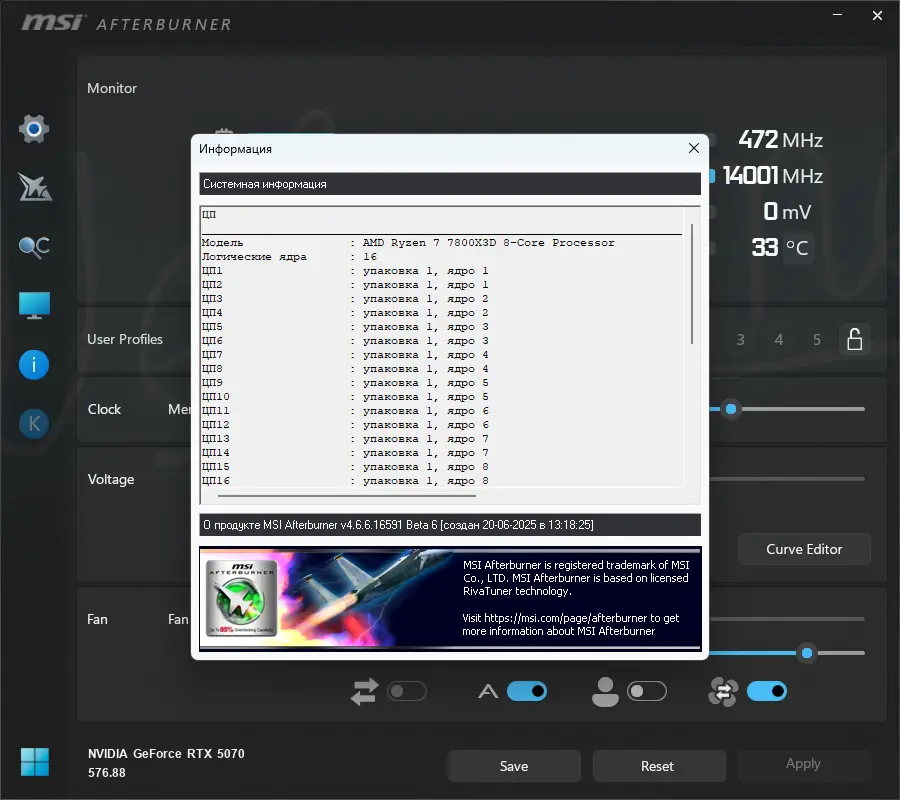 MSI Afterburner — это мощная утилита для тонкой настройки и разгона видеокарт, совместимая с продукцией всех ведущих производителей. Программа предоставляет контроль над частотами GPU, памятью и шейдерами, позволяет регулировать напряжение и управлять оборотами вентиляторов. Встроенные инструменты мониторинга отображают ключевые параметры в реальном времени, включая температуру, загрузку и FPS в игре. Поддержка профилей и горячих клавиш делает процесс настройки максимально удобным.