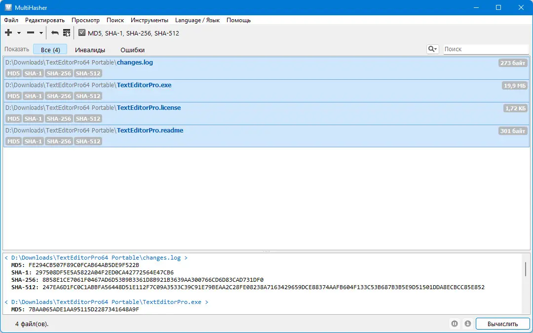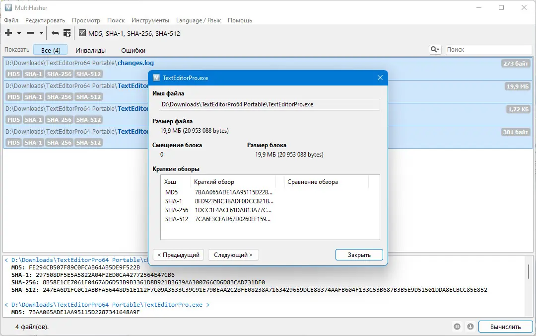 - Вычисление хешей для одного или нескольких файлов одновременно