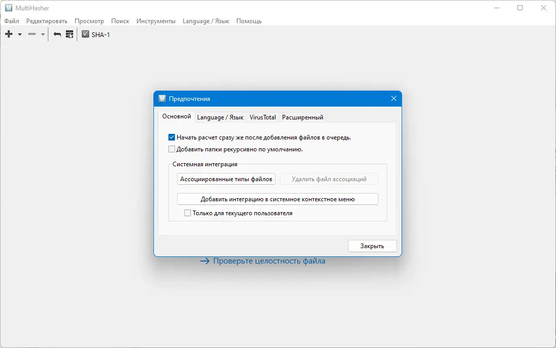 MultiHasher — это бесплатная утилита для вычисления хеш-сумм файлов с поддержкой множества алгоритмов, включая CRC32, MD5, SHA-1, SHA-256 и другие. Программа проста в использовании, не требует установки в портативной версии и интегрируется в контекстное меню проводника Windows.