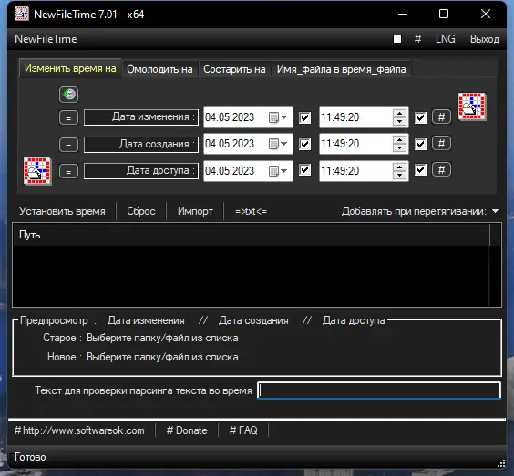 Использование NewFileTime не вызывает затруднений даже у новичков. После запуска приложения достаточно перетащить нужный файл или папку в рабочую область либо добавить его через кнопку выбора. Далее в соответствующих полях указываются требуемые дата и время, после чего изменения применяются одним кликом. Также доступна функция синхронизации времени между файлами или копирования временных меток с одного объекта на другие. Утилита позволяет как вручную задавать параметры, так и использовать предустановленные шаблоны, например, установить текущее время или сдвинуть дату на определённый интервал.